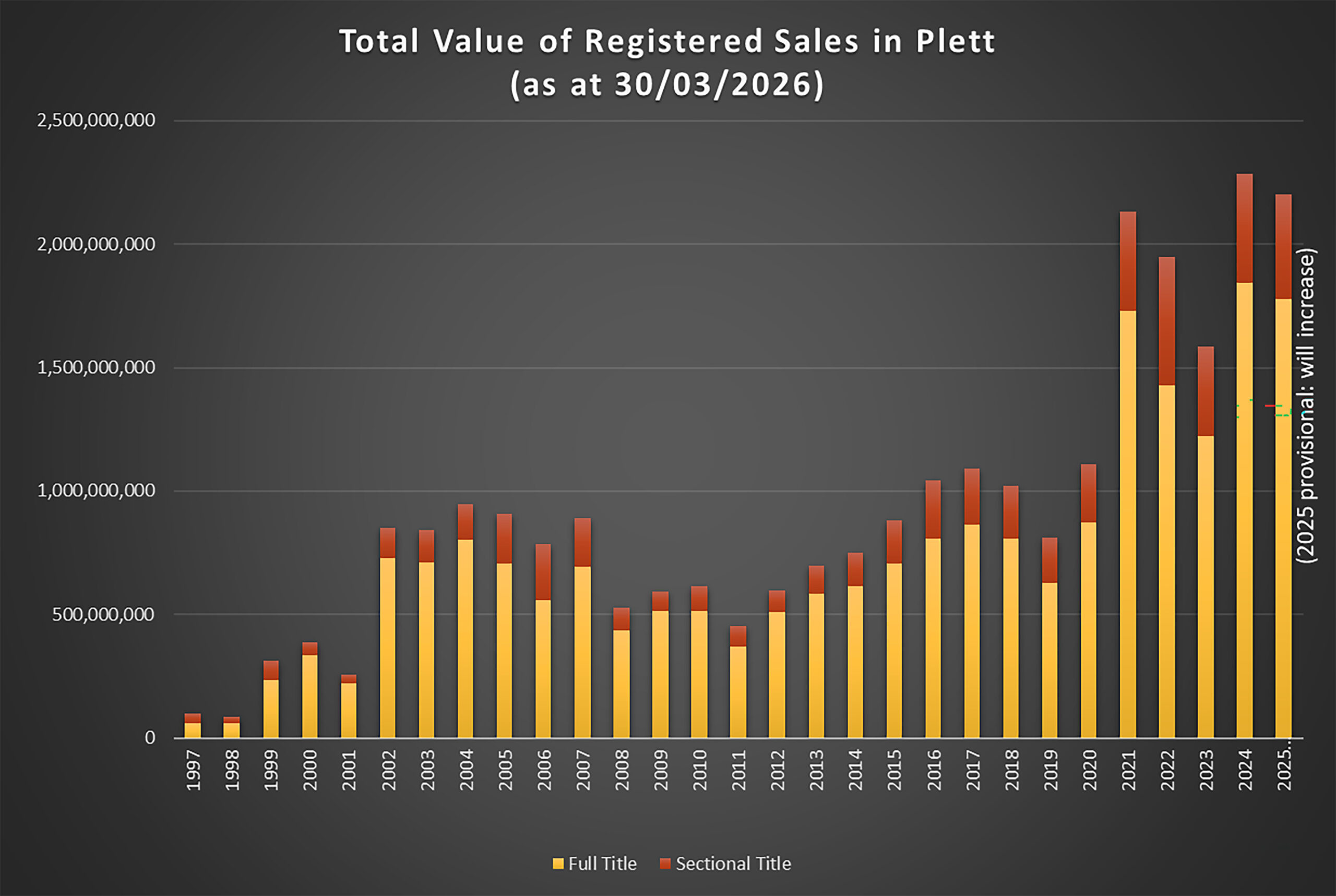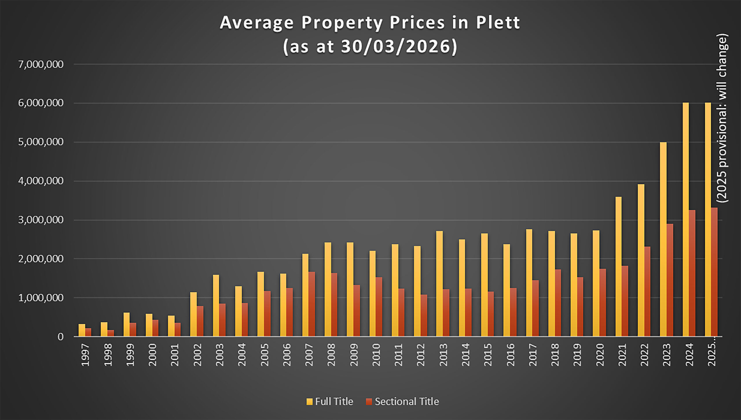 For full title property in 2021 there was a 31% increase in average value (R3,59million) in comparison to a 4,3% increase in sectional title averages (R1,82million). In 2022, sectional title averages increased by 27% to R2,32million and full title by 9% to R3,92million. In 2023, sectional title averages increased by 25% to R2,9million and full title by 27% to R5million. In 2024, sectional title averages increased by 12% to R3,25million and full title by 20% to R6million. So far in 2025, sectional title averages have increased by 2% to R3,3million and full title by 1% (R6million).