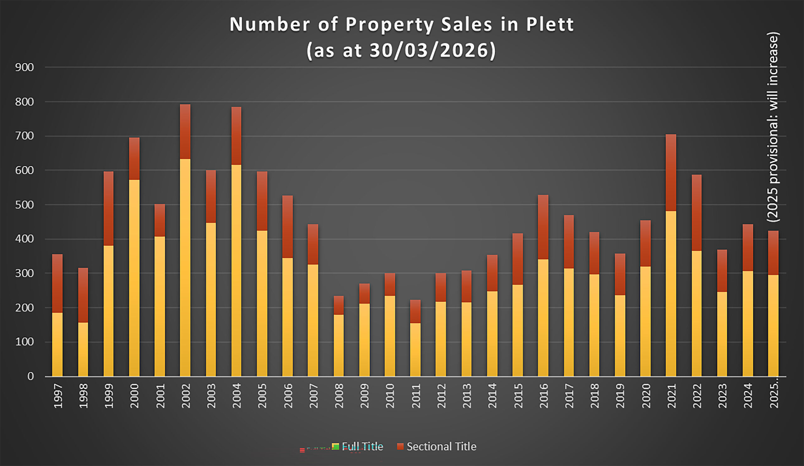 The figures above were taken from deeds information on the 30th of March 2026. Sales for Plett are listed by date of sale, not transfer date, to provide a more accurate depiction of the market. Rural property, sales below R200 000, known non-market-related transactions and duplications (e.g., when a developer buys multiple properties for a single price and each is listed at the full price by the deeds office, only the single figure is taken), and outlying areas are not included in the figures. Many sales are still in the registration process, so the statistics and graphs for the later years, and last year in particular (2025), will change substantially in future. Other statistics are taken from Sotheby’s International Realty Plettenberg Bay’s figures.